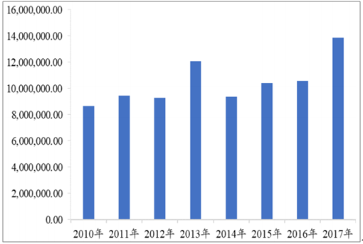 2010-2017年我國進(jìn)口鉻礦數(shù)量變化(噸)
