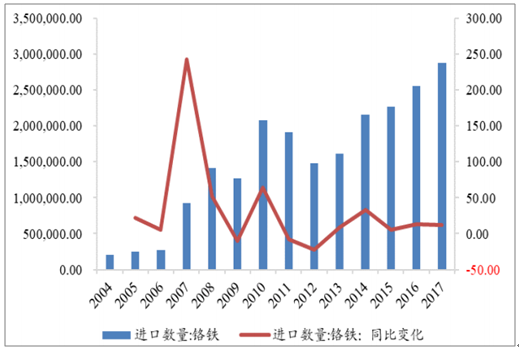 2004-2017年我國鉻鐵進(jìn)口數(shù)量(噸)及其同比變化(%)