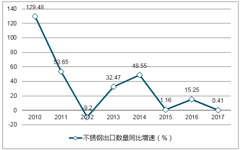 2009-2017年,我國不銹鋼出口數(shù)量年均復(fù)合增長率為28.37%;但近年來增速放緩,2017年實(shí)現(xiàn)不銹鋼出口數(shù)量395.30萬噸,同比增長0.41%,創(chuàng)歷史新高。據(jù)中國特鋼企業(yè)協(xié)會不銹鋼分會最新數(shù)據(jù),2018年一季度全國出口不銹鋼102.4萬噸,與2017年一季度同比增加12.3萬噸,增長13.7%。