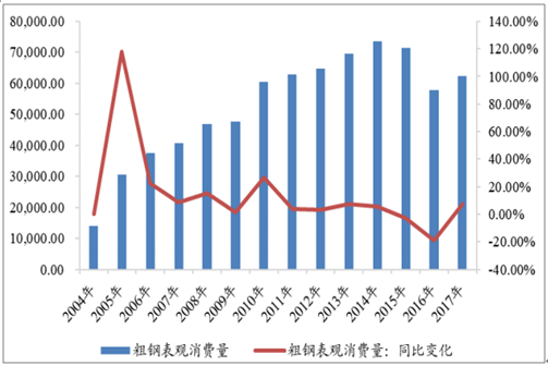 2017年,我國粗鋼表觀消費(fèi)量為62,352.57萬噸,同比增長7.76%,創(chuàng)10年來最高增速;不銹鋼表觀消費(fèi)量自2008年后持續(xù)高速增長,但近年來增速放緩,2017年,不銹鋼表觀消費(fèi)量創(chuàng)歷史最高水平1984.68萬噸,增速為5.37%。