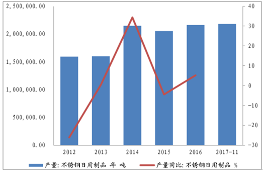 2015-2017年的產(chǎn)量可由不銹鋼日用品產(chǎn)量側(cè)面反映,在此期間,不銹鋼日用品產(chǎn)量穩(wěn)定增長,2016年不銹鋼日用品產(chǎn)量216.09萬噸,同比增長5.23%,截至2017年11月,不銹鋼日用品產(chǎn)量已達(dá)217.83萬噸,預(yù)計(jì)2017年將穩(wěn)速增長。