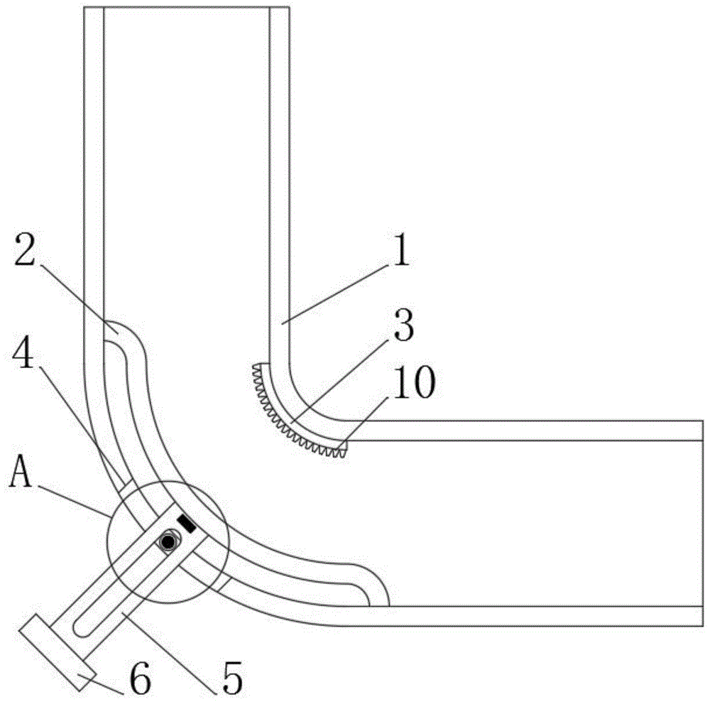 1不銹鋼彎頭、2橡膠保護墊、3清洗墊、4活動孔、5移動桿、6接觸圓盤、7轉軸、8條形轉孔、9磁鐵塊、10清洗齒。
